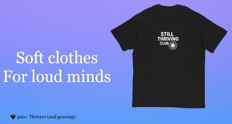 Still Thriving Club is a UK-based mental health clothing brand making soft, ADHD-friendly apparel for the burnt out but still blooming.