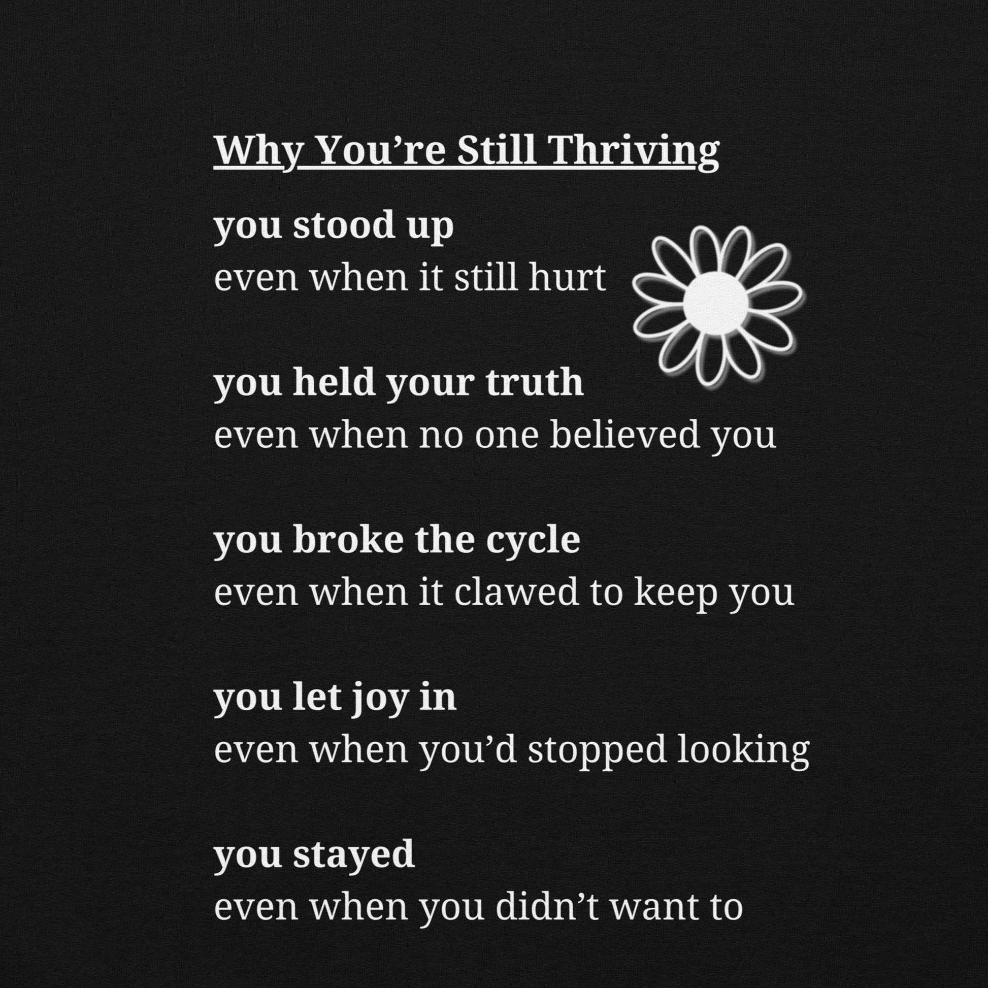 From the Still Thriving Club – your flagship comfort hoodie for the ones who keep going, wrapped in softness and strength. This is more than clothing; it's your wearable reminder that surviving is thriving. 💙